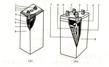 1一接線柱;2一蓋;3安全閥;4一防爆陶瓷過濾器;5正極板;6一隔板;7~負極板;8一外殼;9端子膠