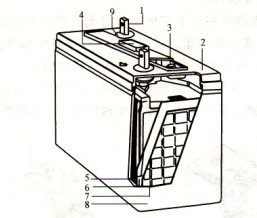 1一接線端子;2一蓋;3~安全閥;4一極柱;5一正極板;6一隔板;7一負極板;8--#b.殼;9一端子膠