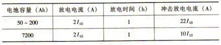 1)100%容量沖擊電流放電能力。當(dāng)蓄電池容量達(dá)到滿容量時(shí),對(duì)容量為50~200Ah的電池用25I10沖擊電流值,容量大于200Ah的電池用20I10沖擊電流值,沖擊l0次,每次500ms的沖擊放電,每兩次放電時(shí)間問隔為2s,直流母線的電壓不得低于90%UN(UN為直流系統(tǒng)額定電壓)。